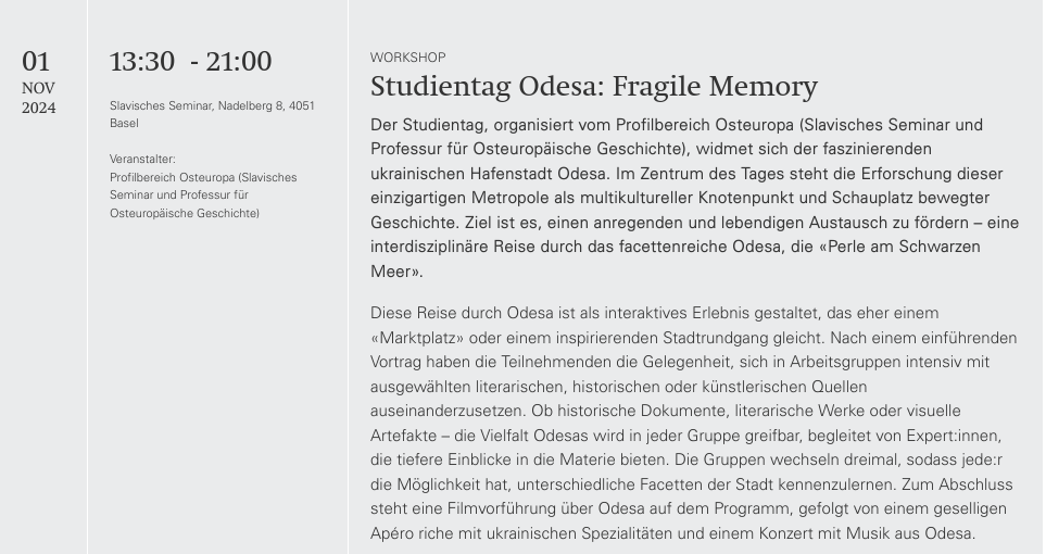 Der Studientag, organisiert vom Profilbereich Osteuropa (Slavisches Seminar und Professur für Osteuropäische Geschichte), widmet sich der faszinierenden ukrainischen Hafenstadt Odesa. Im Zentrum des Tages steht die Erforschung dieser einzigartigen Metropole als multikultureller Knotenpunkt und Schauplatz bewegter Geschichte. Ziel ist es, einen anregenden und lebendigen Austausch zu fördern – eine interdisziplinäre Reise durch das facettenreiche Odesa, die «Perle am Schwarzen Meer».